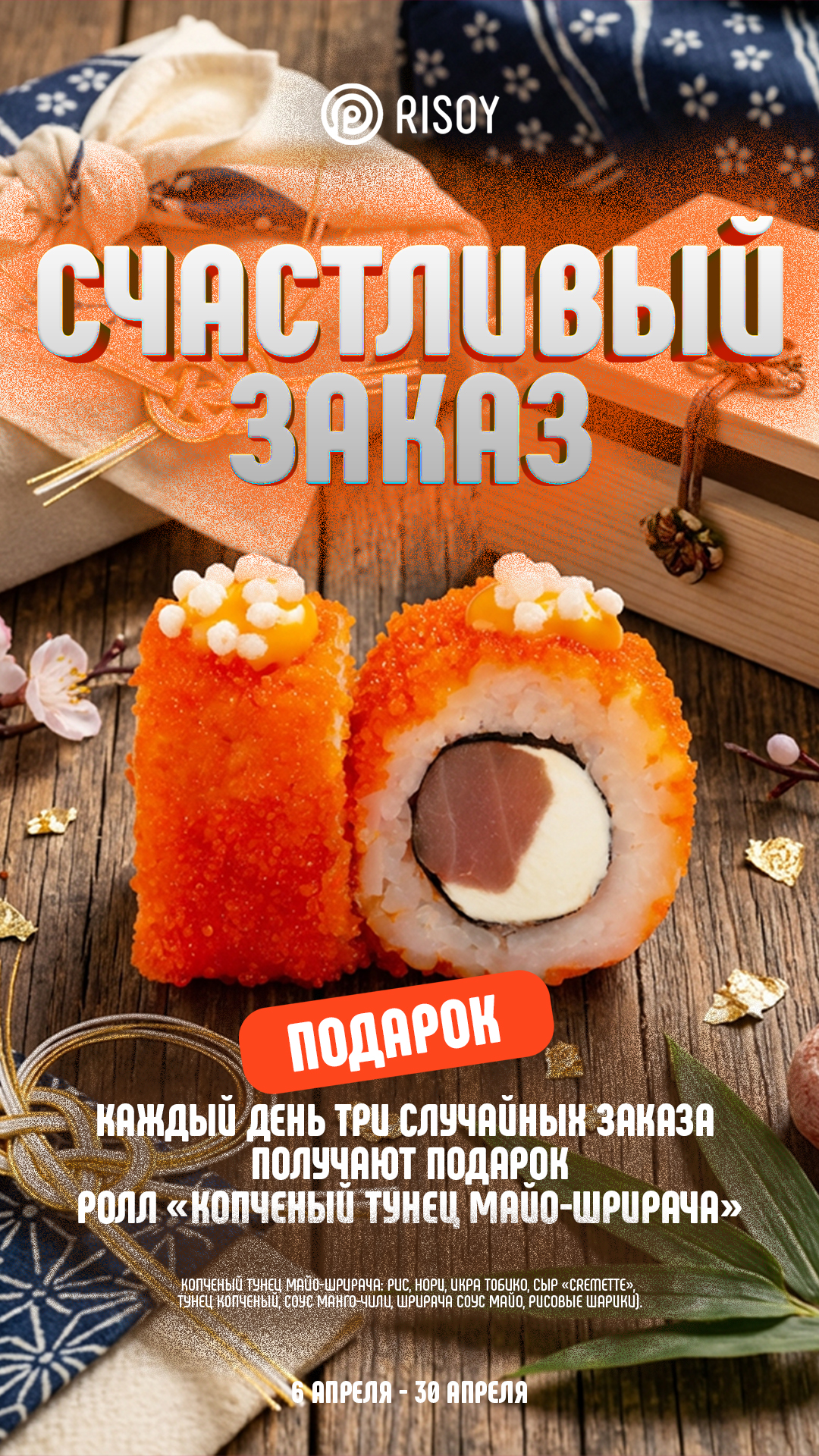 С 6 по 30 апреля, несколько раз в неделю мы выберем 3 случайных заказа в день, к которым добавим подарок - ролл «Копчёный тунец майо-шрирача»: рис, нори, икра тобико, сливочный сыр, копчёный тунец, соус манго-чили, соус майо со шрирачей, рисовые шарики.
